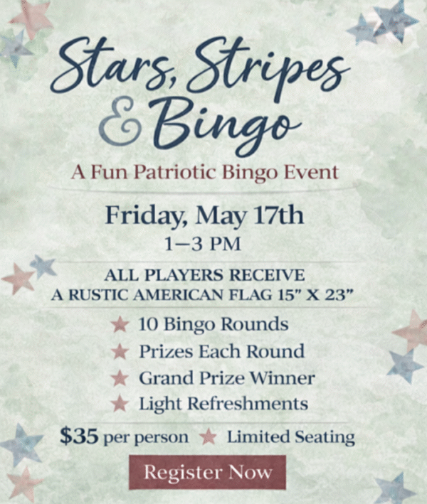 Stars, Stripes and Bingo with Donna STARS, STRIPES & BINGO WITH DONNA Sunday, May 17th from 1–3 PM Class fee: $35 Seats available: 20 Registration ends: Saturday May 16th @ 8am Registration link: https://square.link/u/tIfmRJ8X?src=smsic A Patriot Bingo Afternoon You Don’t Want… Continue Reading →